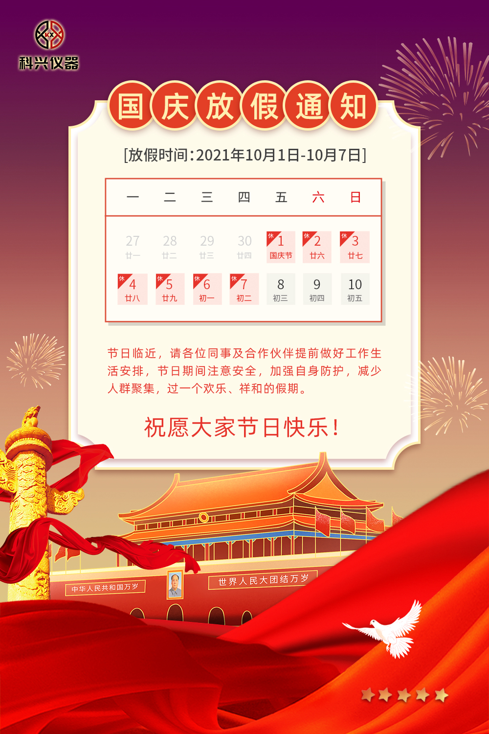 您好!感謝大家一直以來(lái)對上??婆d儀器的信任和支持,在國慶節來(lái)臨之際,我司決定于10月1日至10月7日放假7天,10月8日起恢復正常工作,給您帶來(lái)的不便敬請諒解,謝謝合作!