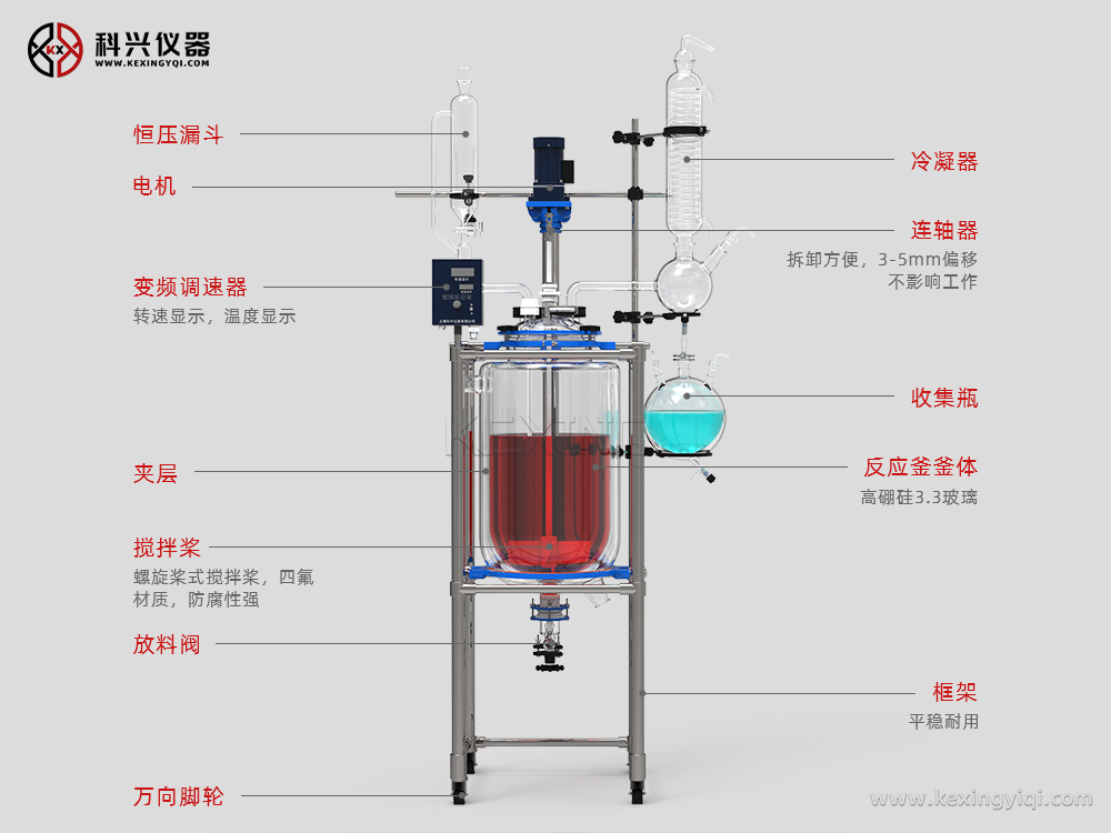 雙層玻璃反應釜為雙層玻璃設計,內層放入反應溶媒可做攪拌反應,夾層可通上不同的冷熱源(冷凍液,熱水或熱油)做高溫反應或低溫反應。