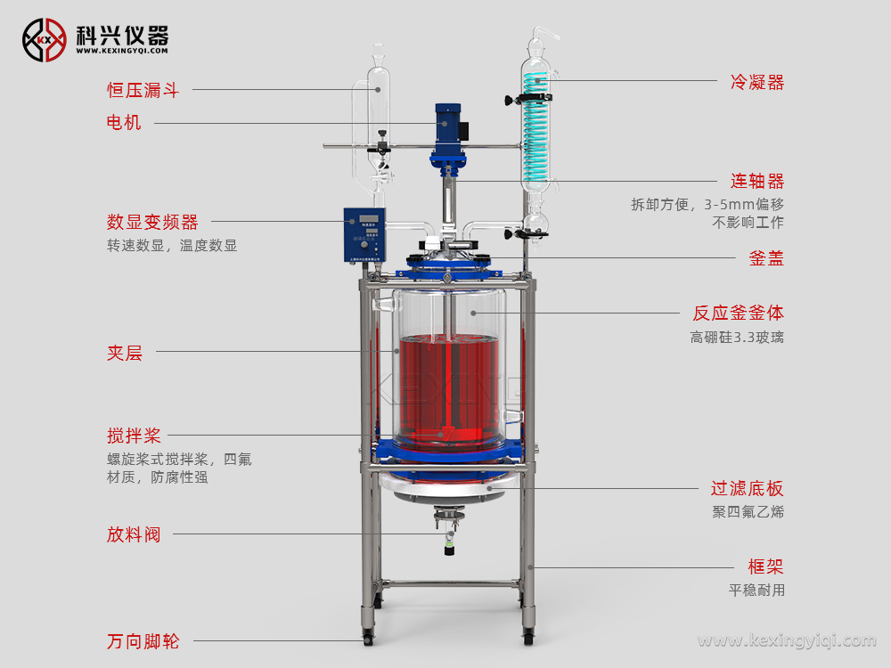 主要用于制藥、化工、實(shí)驗室等機構的有機合成實(shí)驗室用中式設備,用于有機物合成實(shí)驗中,是生化制藥中的主要設備之一。釜體為雙層玻璃燒結而成,雙層之間可通過(guò)冷卻液和加熱液。釜底過(guò)濾篩板的設計,讓設備能承受100KG反應液的壓力。過(guò)濾裝置采用法蘭和四氟材料制成與釜體相連,過(guò)濾器為玻璃砂芯,方便拆卸清洗更換。